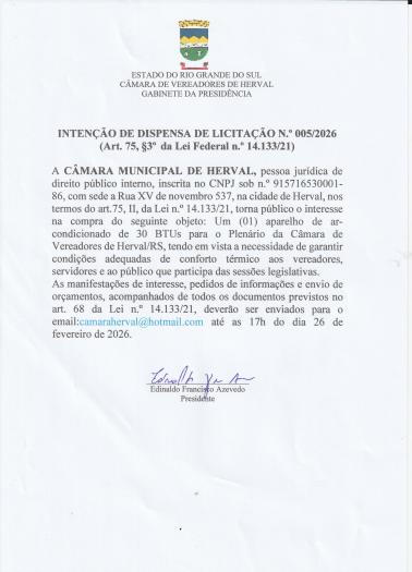 Compra de um aparelho de ar condicionado de 30 BTUs para o Plenário da Câmara.