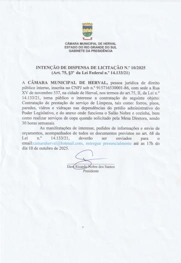 INTENÇÃO DE DISPENSA DE LICITAÇLÃO 10/2025
